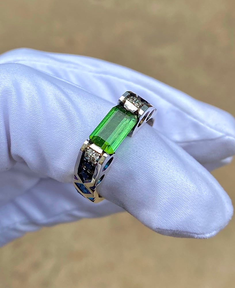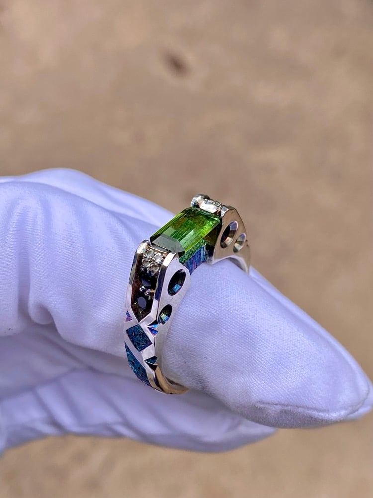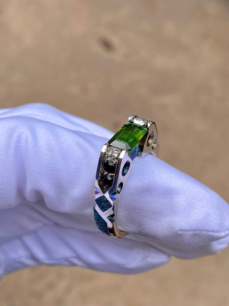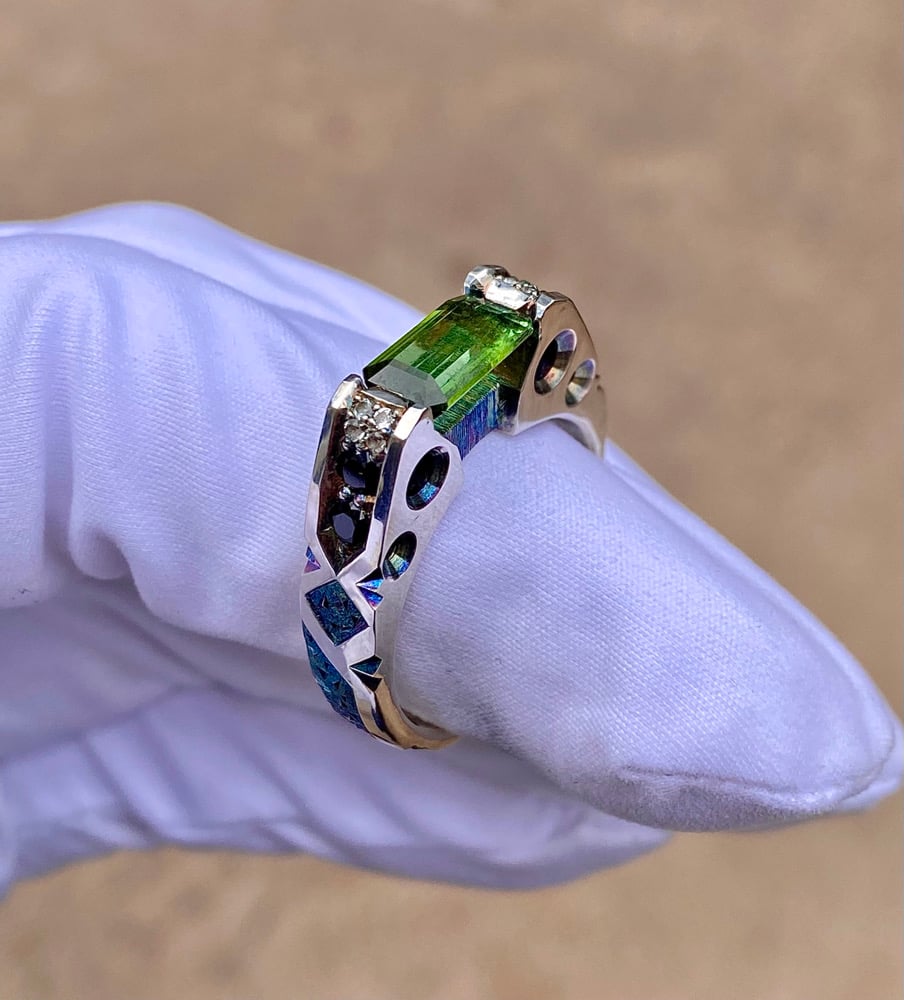 This ring features an afghani tourmaline with black spinel and topaz accents in a handcarved sterling silver frame with los oxidation. Size 11