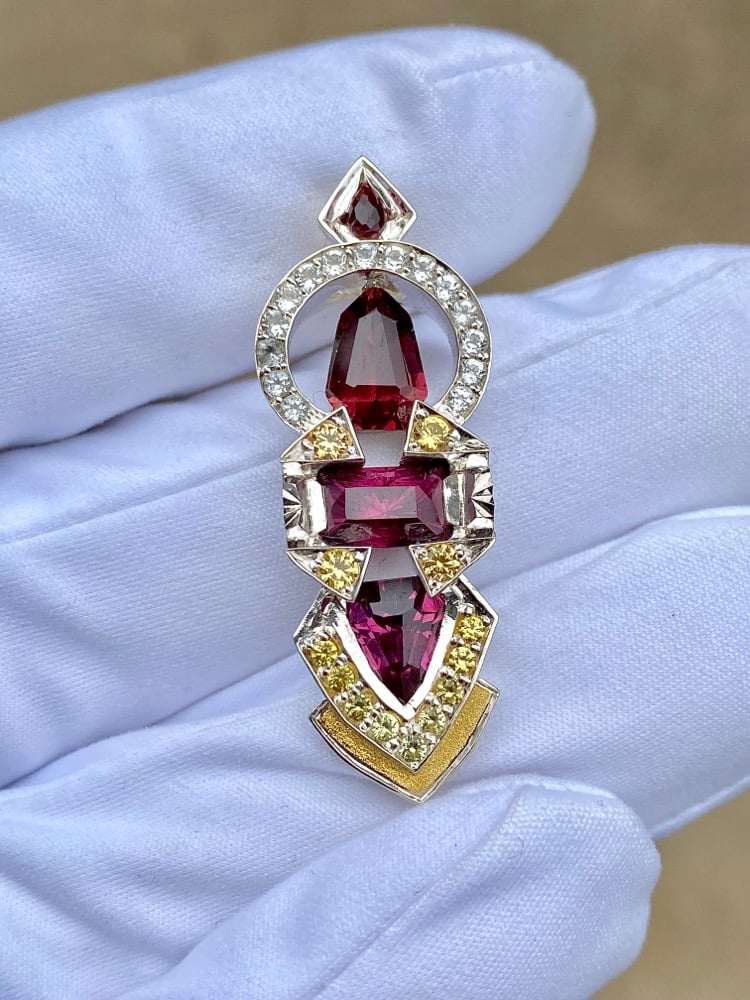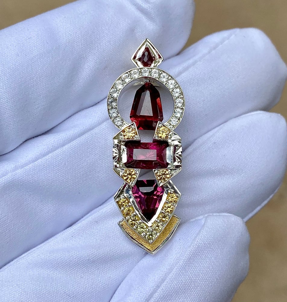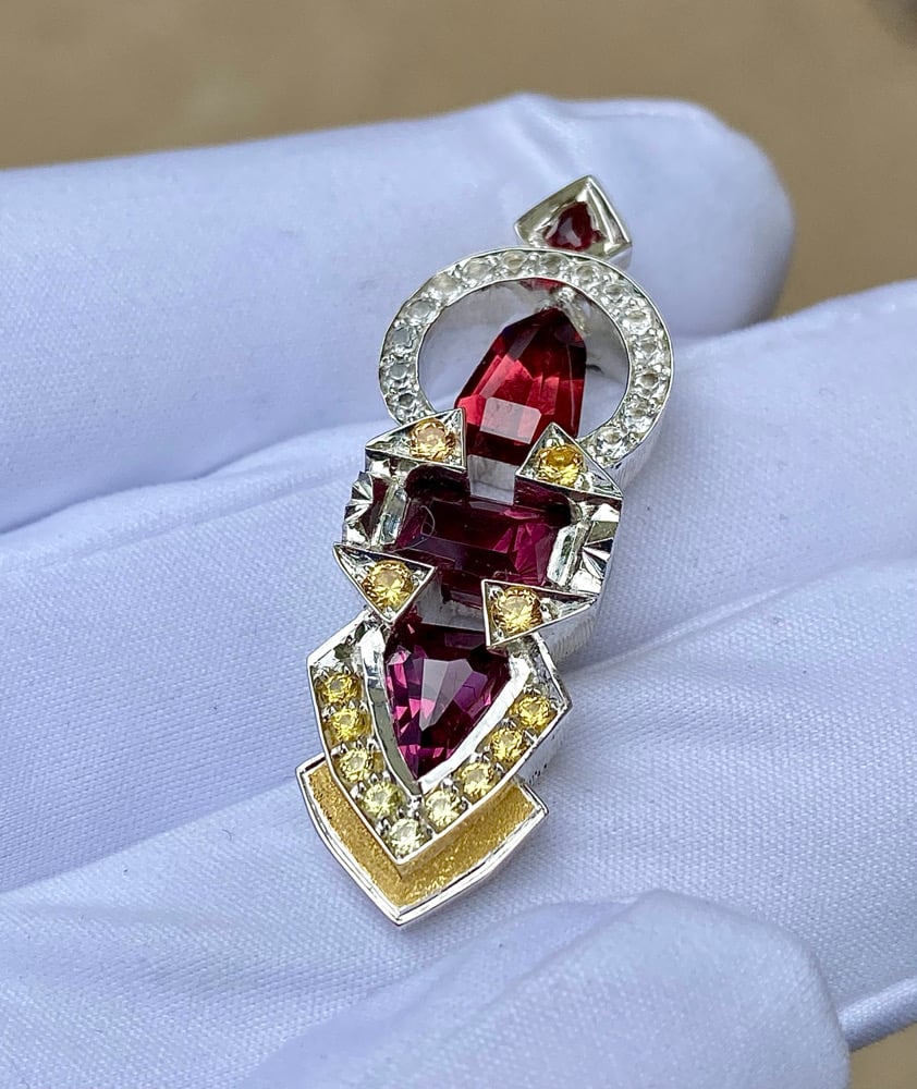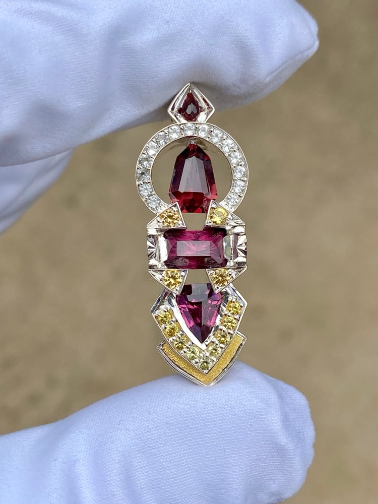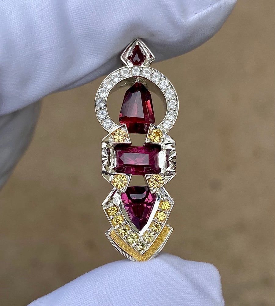 “Dream Oscillator” features Tanzanian rhodolite garnet, Tanazanian almandine garnet and a rubelite tourmaline. The accents are white topaz and sapphire in a sterling silver frame with 24k gold inlay.
