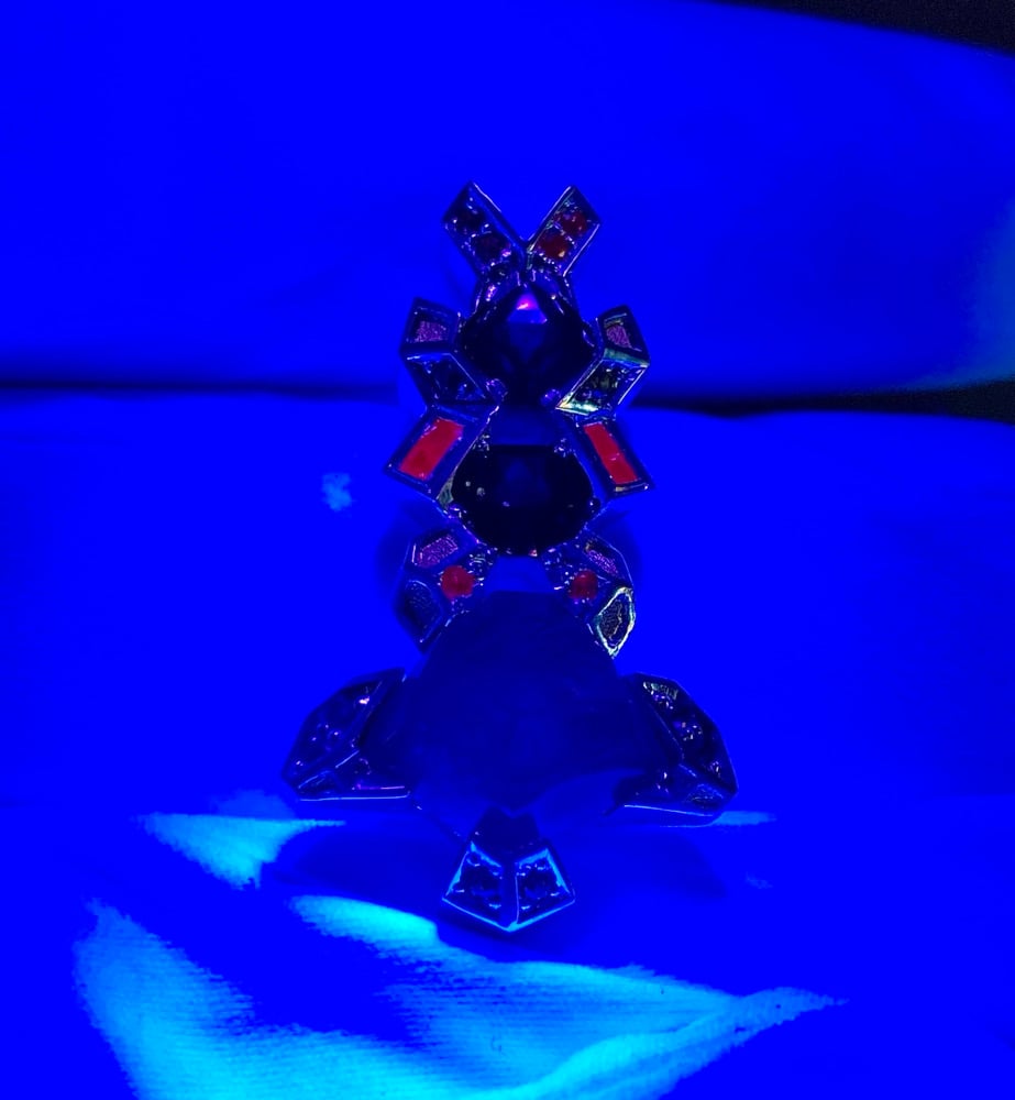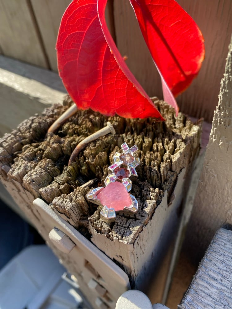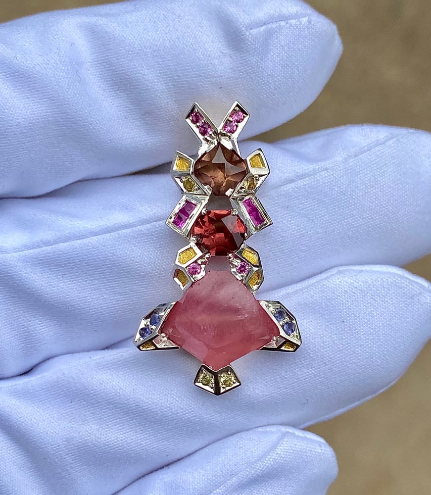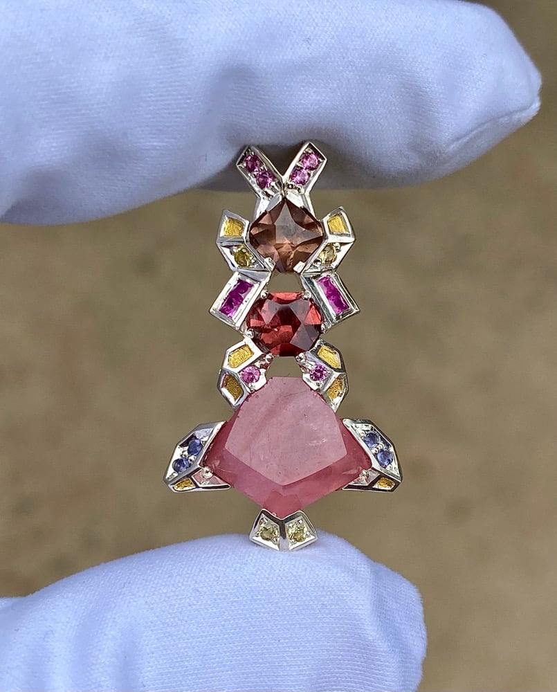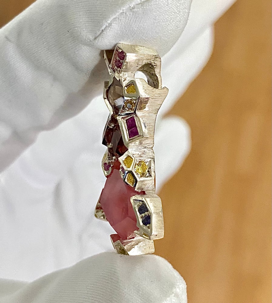 “Split Torn” features a Malaya garnet, a grossular garnet, and a Colorado rhodochrosite. The accents are rubies, sapphires and iolite in a handcarved sterling silver frame with 24k gold inlay. The frame was created using the lost wax method of casting.